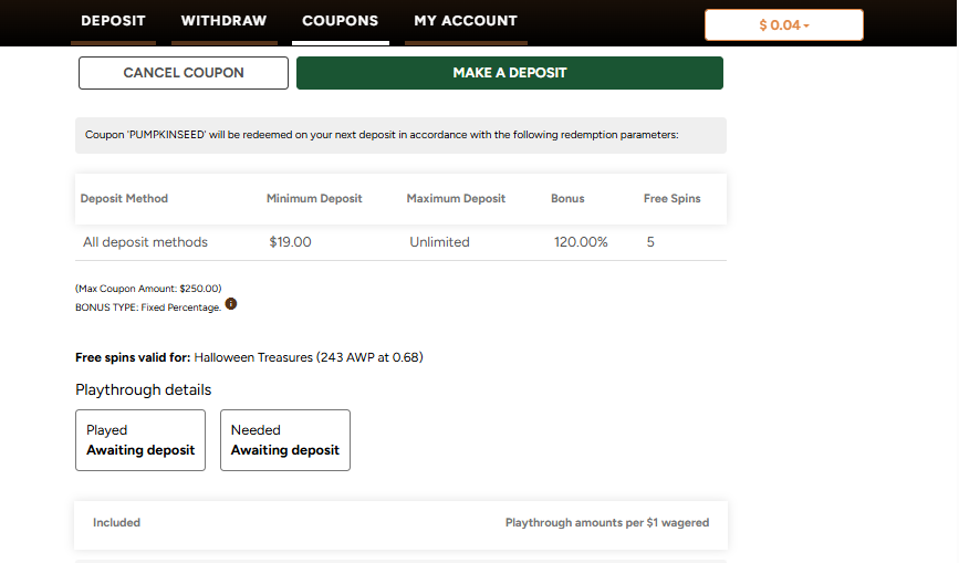 Once you have found the offer you would like to play, you should press the "Make a Deposit" button on the bonus confirmation screen.