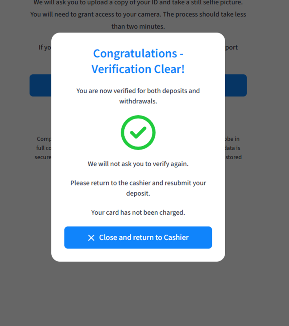 Once you have completed our online verification, please reload the Cashier and try your deposit again, it should go through for you!