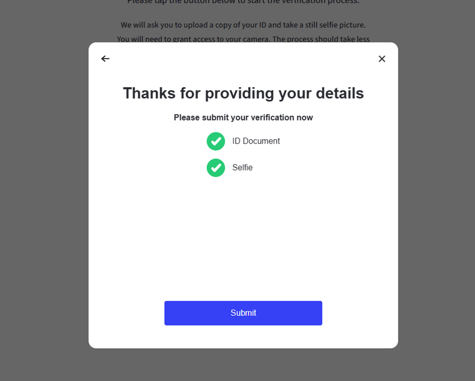 Now that you have taken your selfie, you will see this confirmation screen to let you know both uploads were successful, click the submit button.